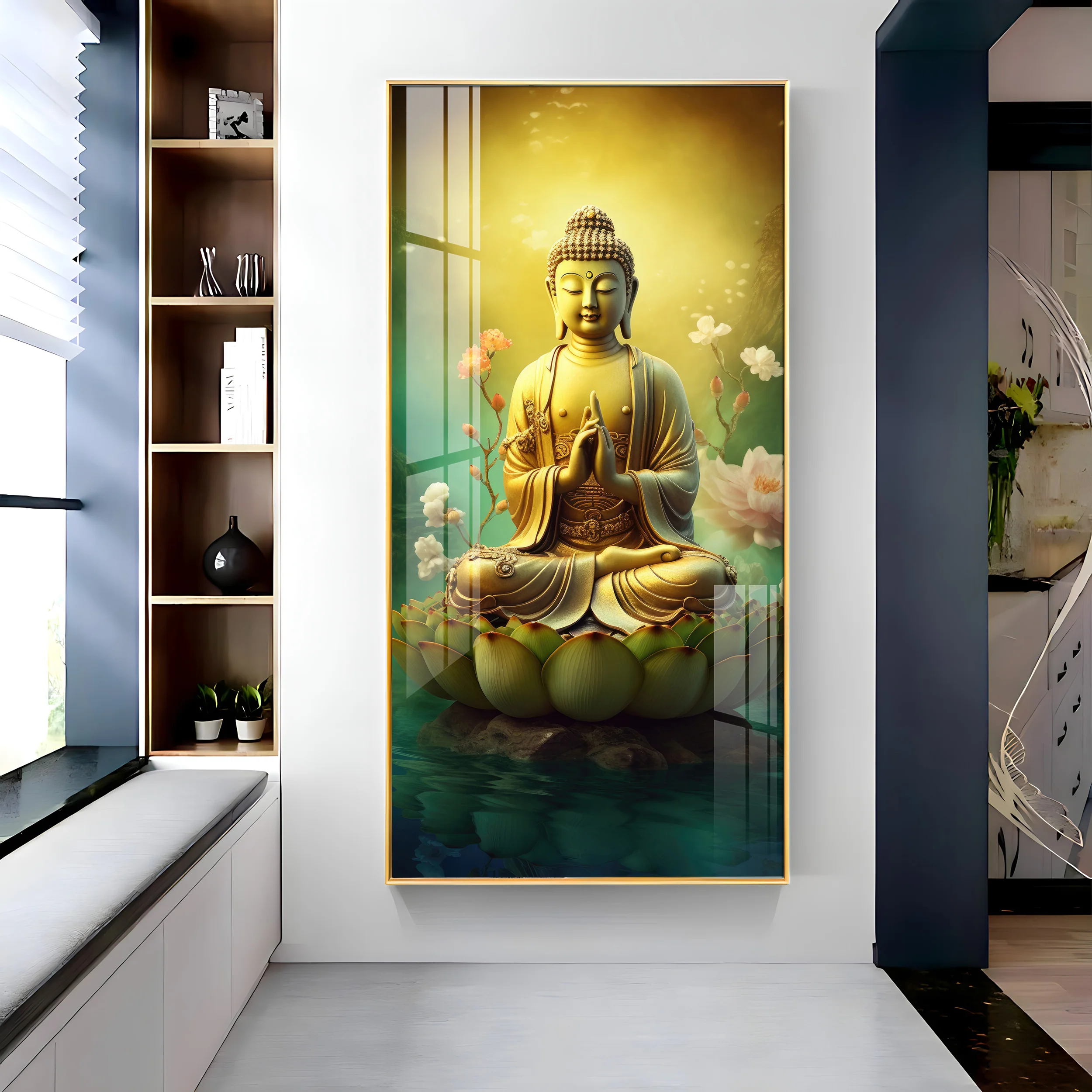 The artwork features a magnificent golden statue of Buddha in a state of deep meditation, seated gracefully on a lotus flower, amidst soft, ethereal lighting and delicate flora. The golden hue symbolizes enlightenment and purity, while the serene expression and classic mudra (hand gesture) radiate a powerful sense of inner peace and wisdom. The gentle reflection on the water and the soft, glowing background enhance its calming and mystical ambiance. Whether you’re designing a virtual meditation room, a peaceful study, a spa-like bathroom, or a calming living area, this painting will serve as a powerful focal point for tranquility.