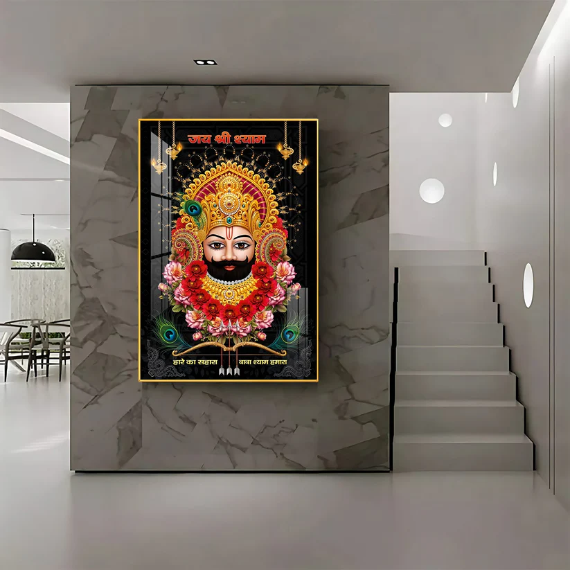 The artwork features a striking and devotional portrayal of Khatu Shyam Baba, adorned with his iconic golden crown, vibrant floral garlands, and the majestic peacock feathers associated with him. The dark, elegant background emphasizes his divine form, while the Hindi inscription “Jai Shri Shyam” (Hail Lord Shyam) further enhances its spiritual significance. Below, the heartfelt words “Haare Ka Sahara, Baba Shyam Hamara” (Support of the Defeated, Baba Shyam is Ours) resonate with comfort and faith. Whether you’re designing a virtual puja room, a serene meditation corner, or a spiritually-minded living area, this painting will radiate a powerful and comforting aura.