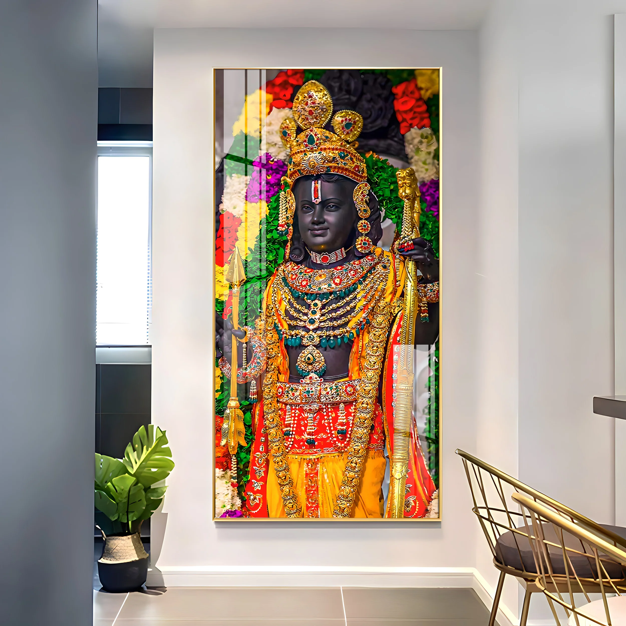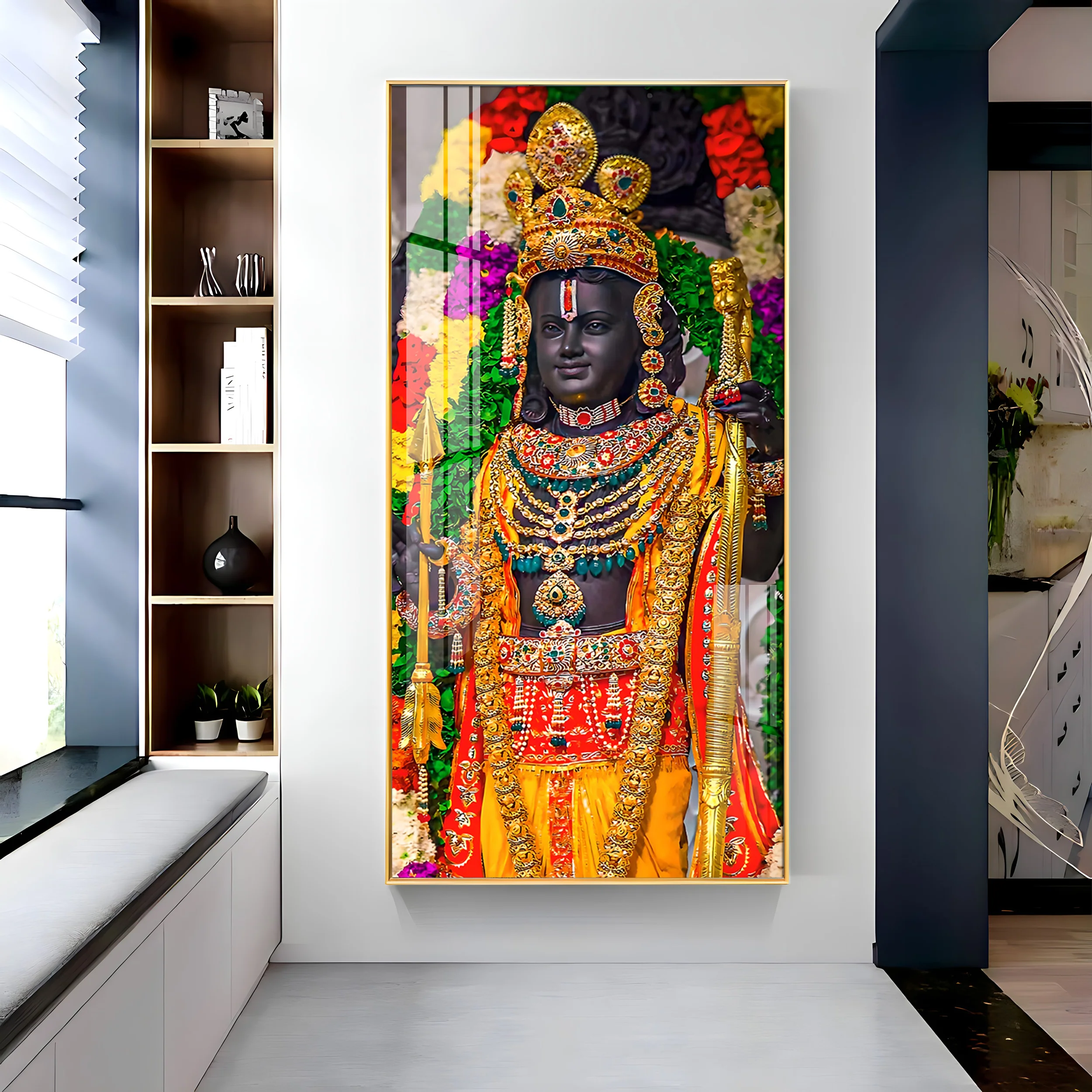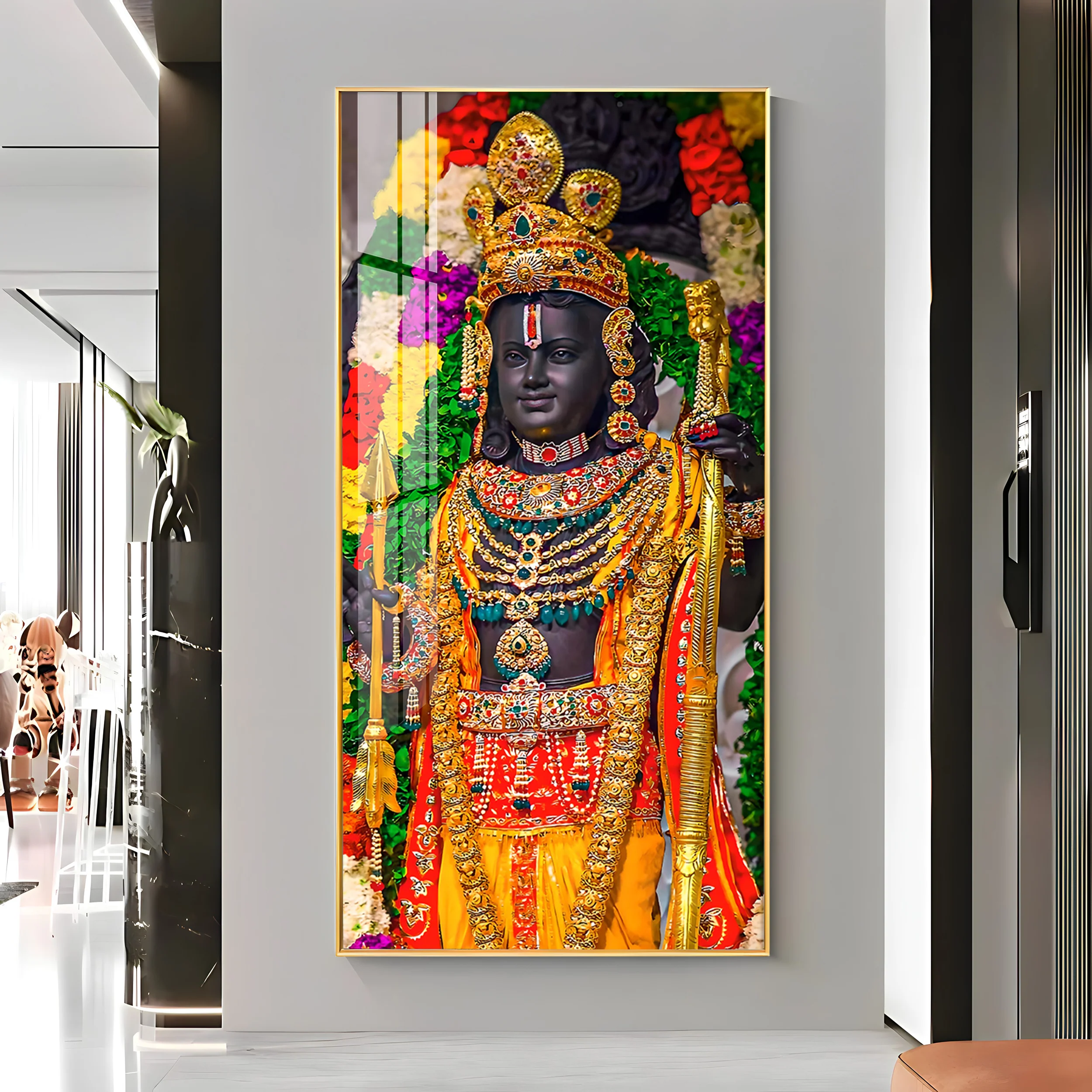 The artwork grandly portrays Lord Ram, adorned with regal attire and divine weapons, standing with a serene yet powerful expression. His form is richly decorated with gold and jewels, symbolizing his royal and divine status. The vibrant floral garlands and the elaborate golden-tipped spear he holds enhance his majestic and protective presence. Whether you’re designing a virtual puja room, a sophisticated lounge, or an impressive entryway, this painting will radiate an aura of sacred strength and tranquility.